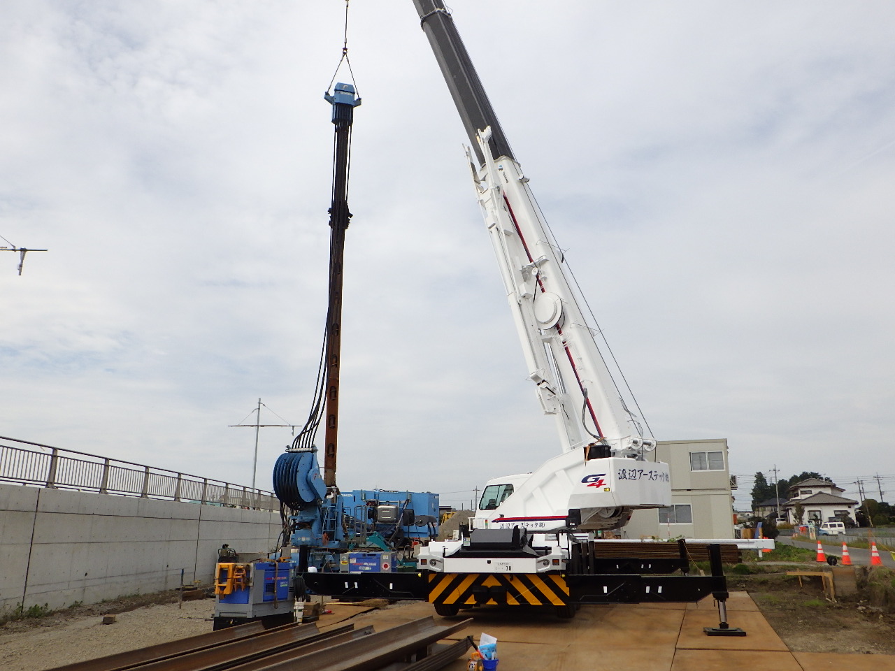 鋼矢板を圧入する機械です。地盤に杭を静荷重で押し込む圧入工法のため無振動、無騒音で、杭施工ができます。
