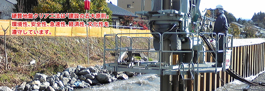 スーパークラッシュ。鋼矢板を圧入する機械です。玉石を含む地盤や砂礫、岩盤層などの硬質地盤でも圧入工法の優位性を損なわず杭施工ができます。現在、U型鋼矢板(400mm幅)、広幅鋼矢板(500,600mm幅)、ハット型鋼矢板(900mm幅)があり、いずれも硬質地盤クリア工法の施工機械があります。弊社ではいずれも対応可能です。
